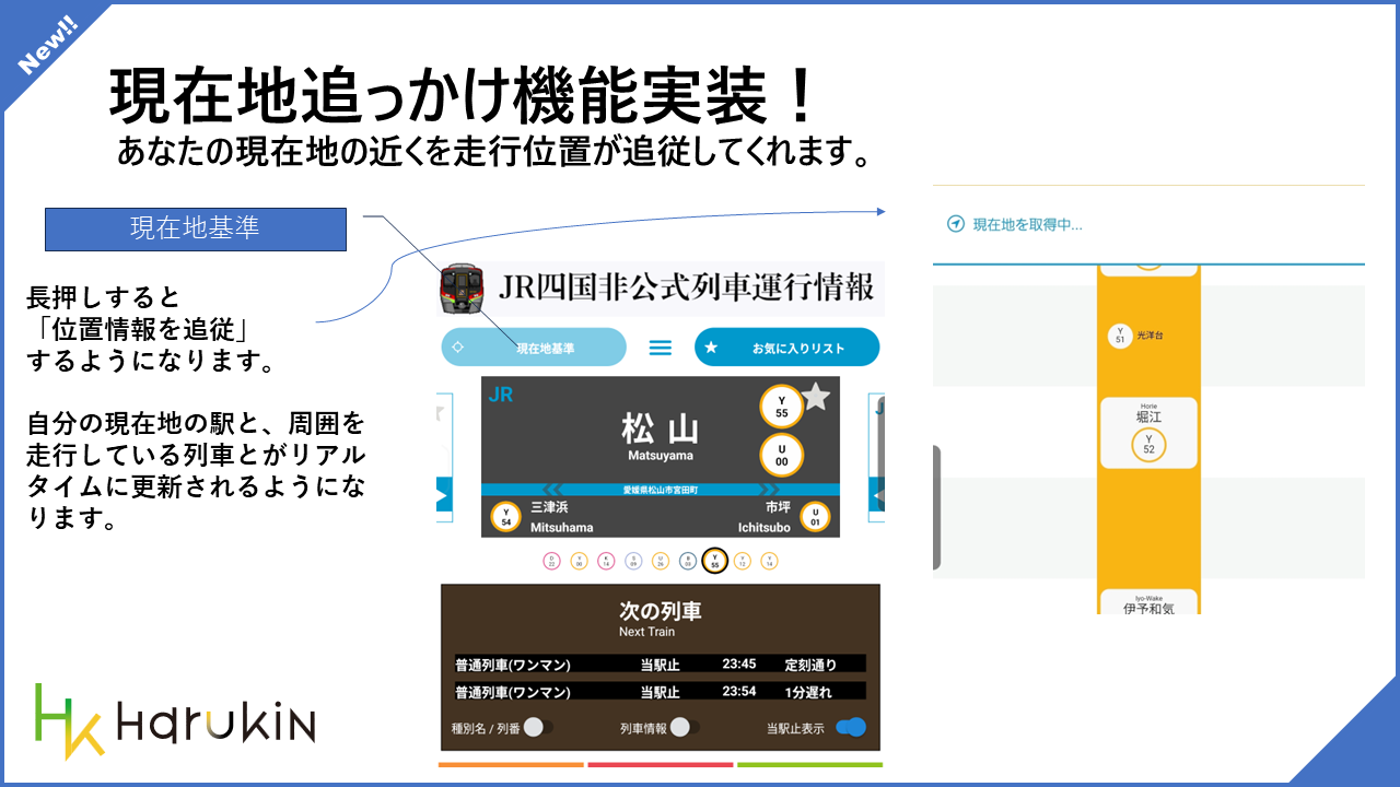 トップメニューの「現在地基準」ボタンを長押しすると、位置情報を追従するモードへ切り替えられるようになりました。これにより、自分の現在地の近くを走っている列車や周囲の駅情報がリアルタイムで更新されるようになります。