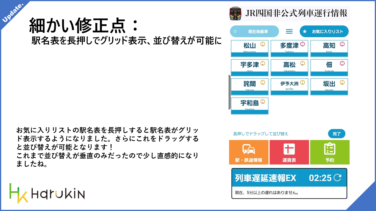 お気に入りリストの駅名表を長押しすると、グリッド表示へ切り替えられるようになりました。さらにそのままドラッグして並び替えもできるため、これまでより直感的に整理できます。
