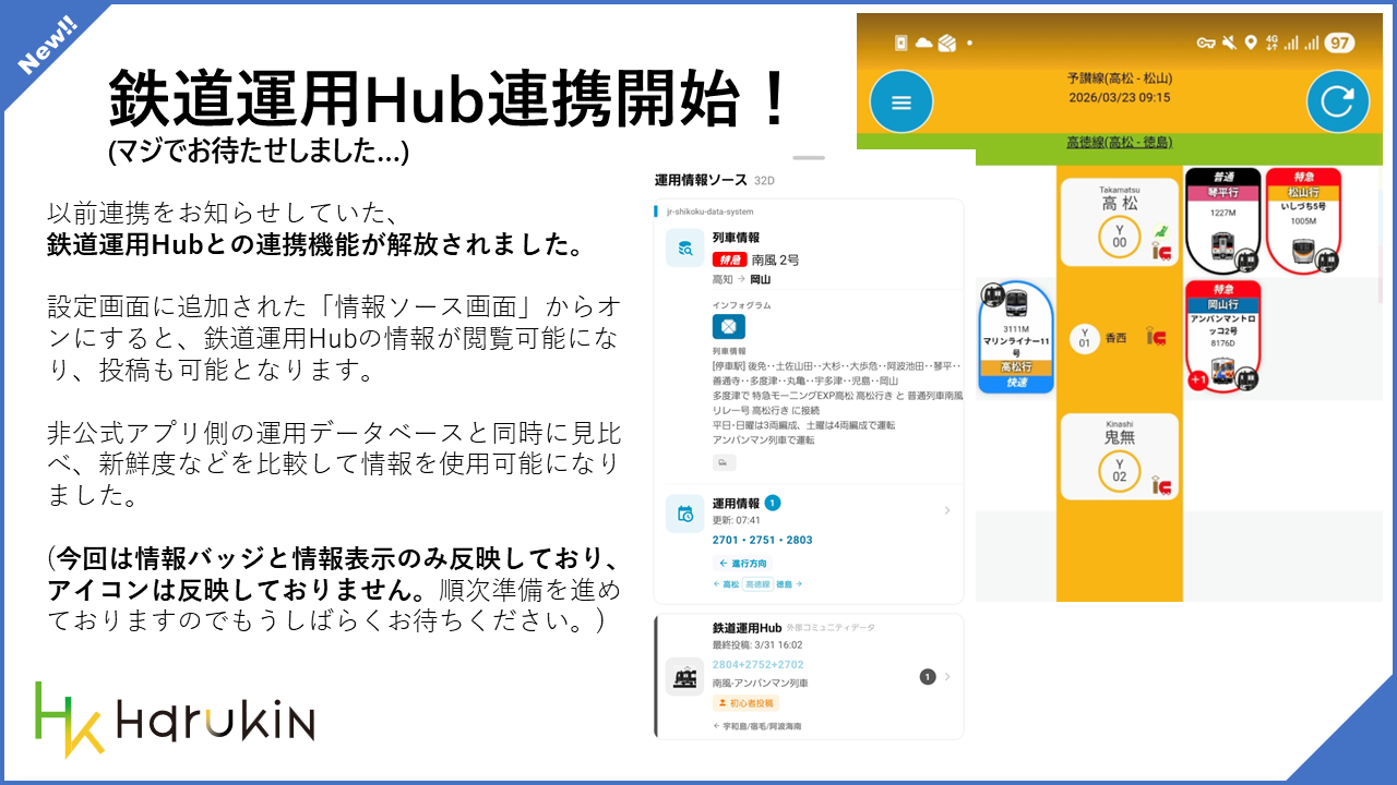 以前からお知らせしていた、鉄道運用Hubとの連携機能をついに解放しました。設定画面に追加された「情報ソース」画面から切り替えることで、鉄道運用Hubの情報を閲覧できるようになります。