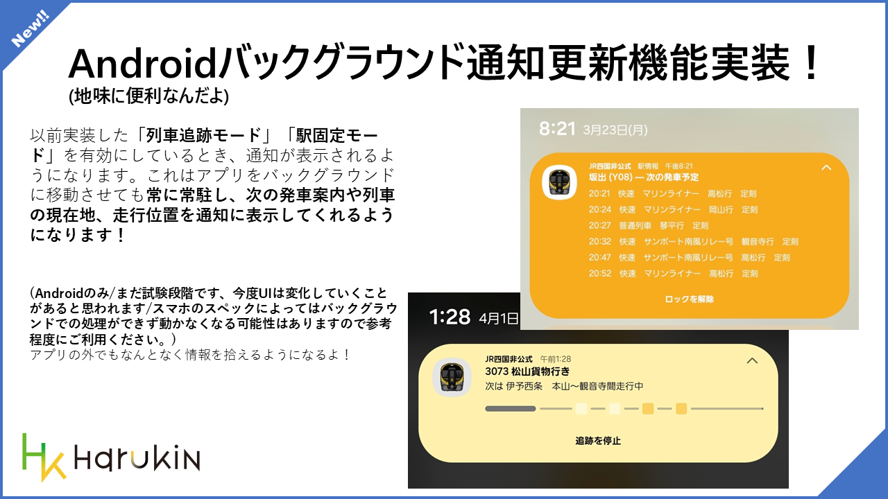 以前実装した「列車追跡モード」「駅固定モード」を有効にしている場合、アプリをバックグラウンドへ移動していても通知上で情報を追えるようになりました。