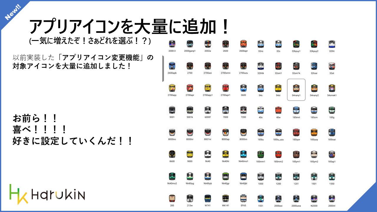 以前からある「アプリアイコン変更機能」に、設定できる対象アイコンを大量追加しました。車両ごとの顔アイコンをかなり増やしているので、好みの編成や車両に合わせて遊べます。