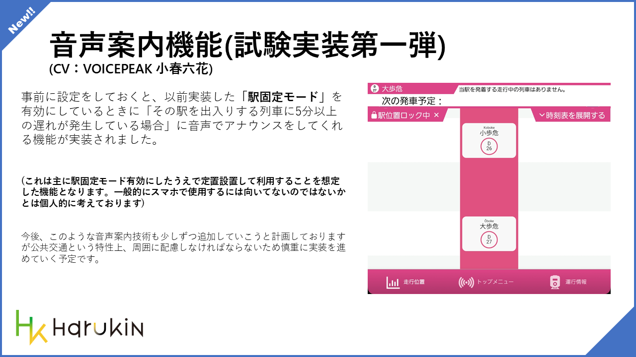 事前に設定しておくことで、「駅固定モード」を有効にしている際に、その駅を出入りする列車で 5 分以上の遅れが発生している場合に音声で案内を行う機能を追加しました。